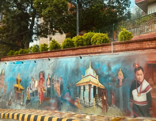 Title: Encountering Art Along the Street Artist: Unknown Location: Kathmandu, Nepal Visual Description The image shows a huge art on a long exterior wall on the side of…